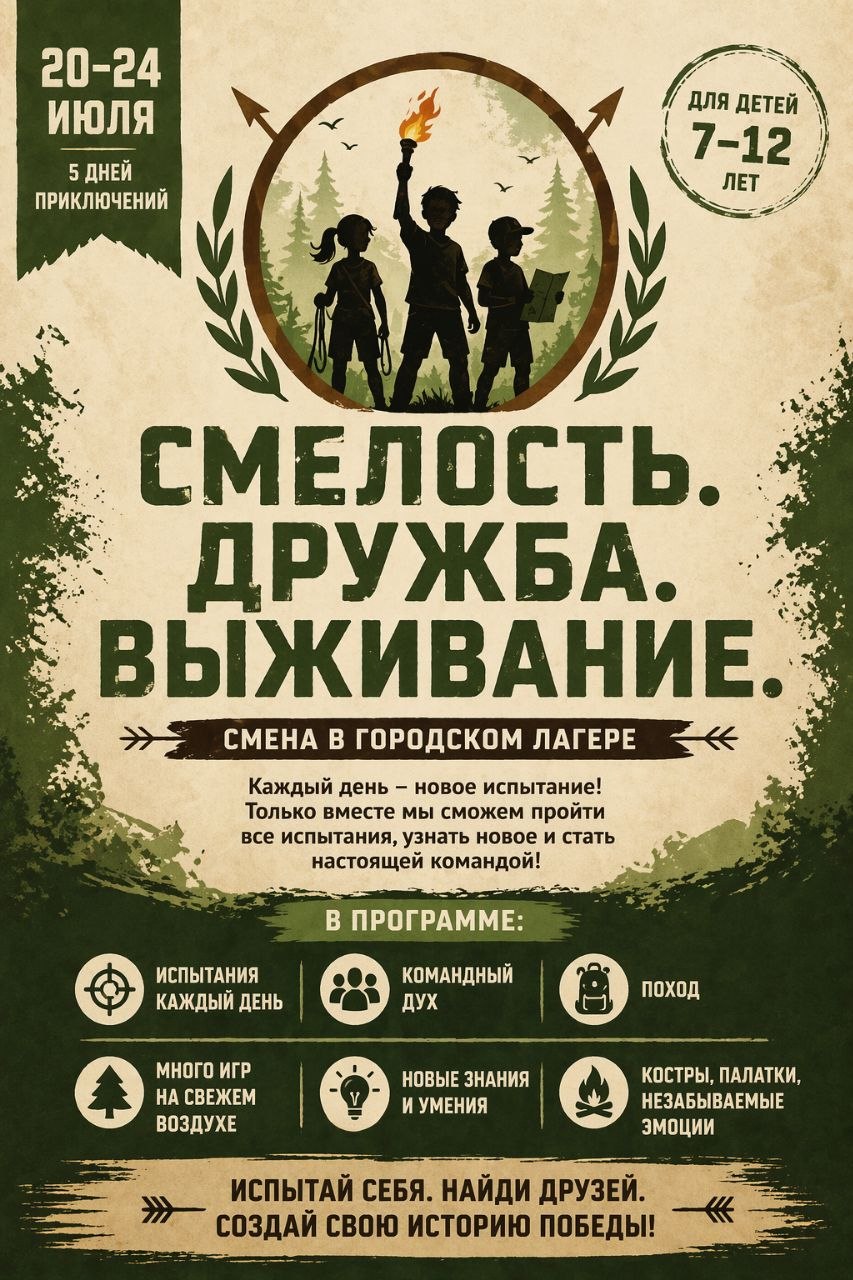 Эта смена — не просто городской лагерь, а захватывающая игра на выживание, где каждый день — новое испытание, новая цель и новая победа!